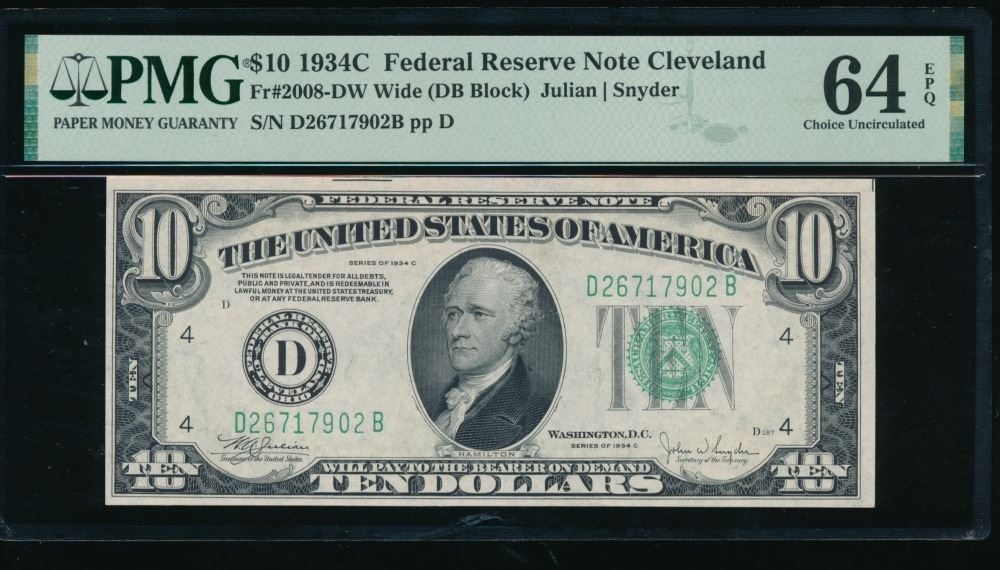 One 1934C $10 Cleveland FRN PMG 64EPQ.