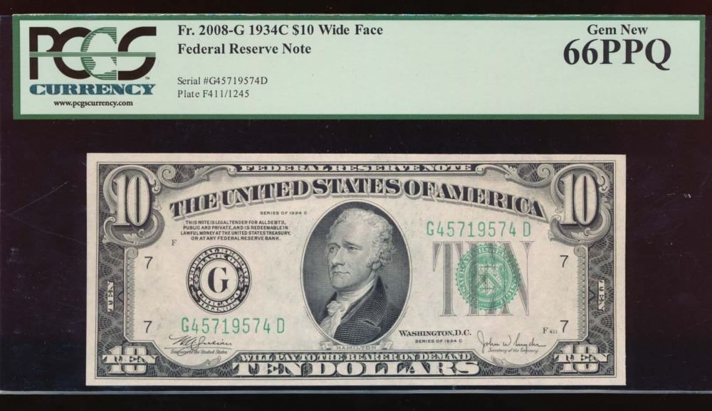 One 1934C $10 Federal Reserve Note PCGS 66PPQ.