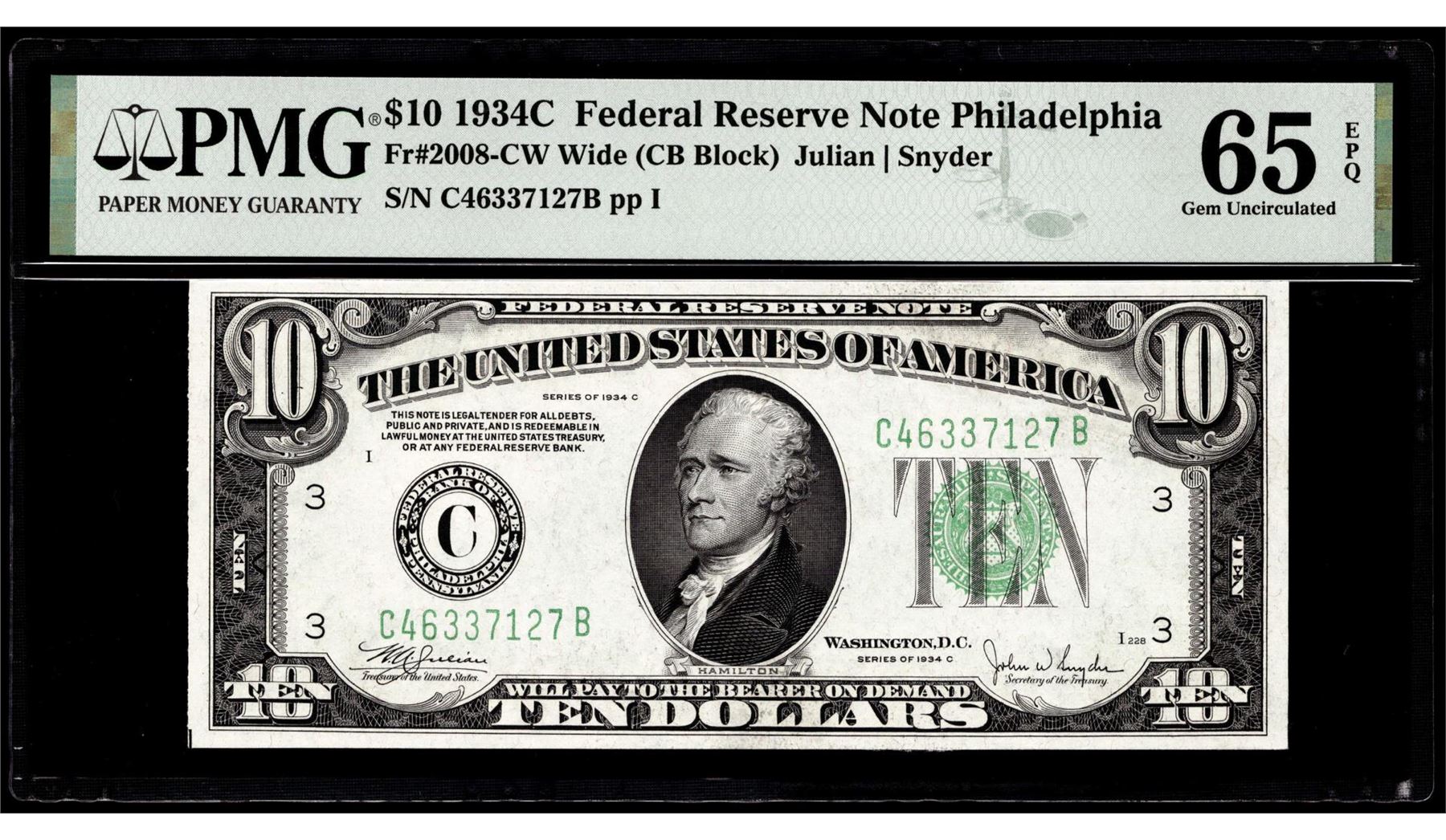 One 1934C $10 Federal Reserve Note Philadelphia Fr.2008-CW PMG Gem Uncirculated 65EPQ. PMG Certified.