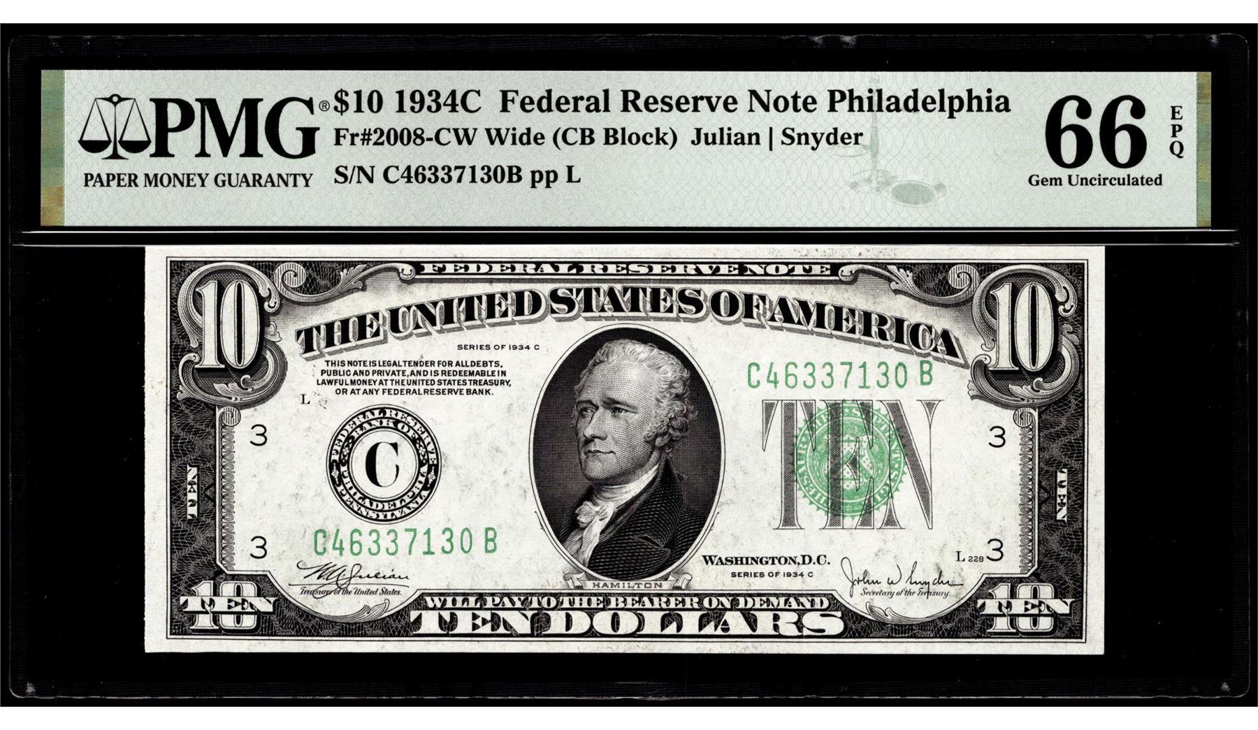 One 1934C $10 Federal Reserve Note Philadelphia Fr.2008-CW PMG Gem Uncirculated 66EPQ. PMG Certified.