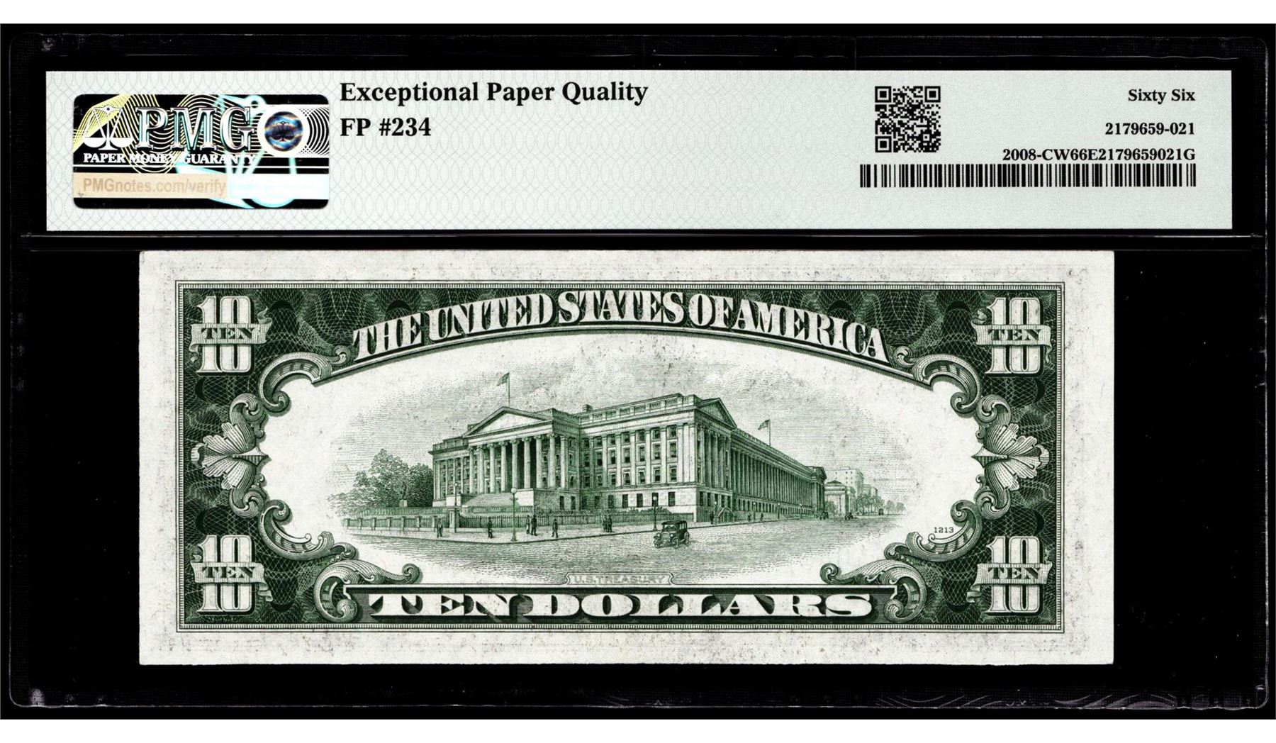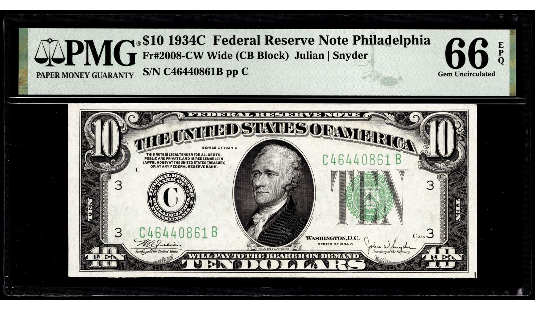 One 1934C $10 Federal Reserve Note Philadelphia Fr.2008-CW PMG Gem Uncirculated 66EPQ. PMG Certified.
