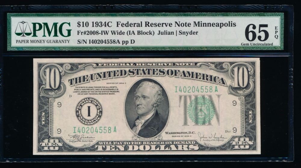 One 1934C $10 Minneapolis Federal Reserve Note 65EPQ.