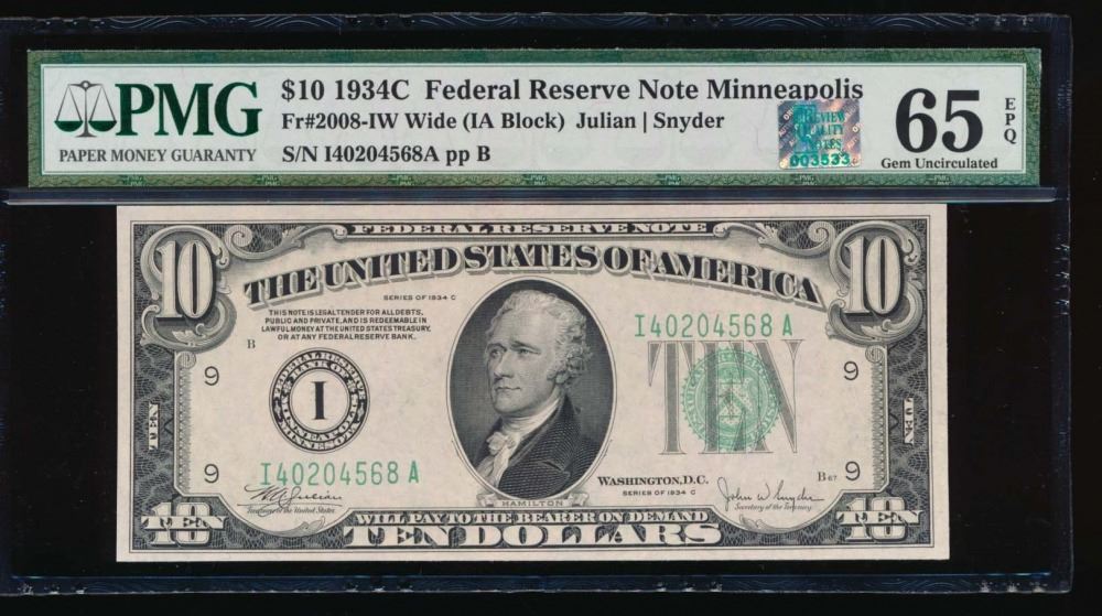 One 1934C $10 Minneapolis Federal Reserve Note PMG 65EPQ.