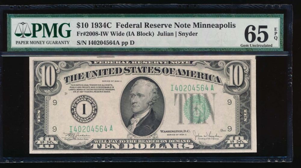 One 1934C $10 Minneapolis Federal Reserve Note PMG 65EPQ.