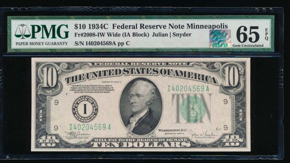 One 1934C $10 Minneapolis Federal Reserve Note PMG 65EPQ.