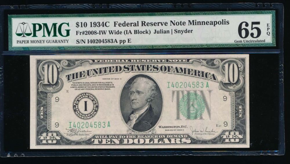 One 1934C $10 Minneapolis Federal Reserve Note PMG 65EPQ.