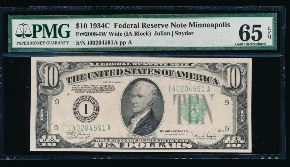 One 1934C $10 Minneapolis Federal Reserve Note PMG 65EPQ.