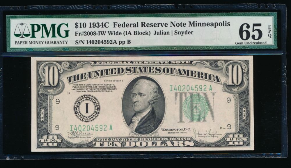 One 1934C $10 Minneapolis Federal Reserve Note PMG 65EPQ.