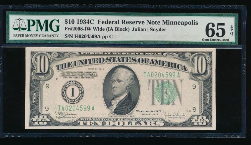 One 1934C $10 Minneapolis Federal Reserve Note PMG 65EPQ.