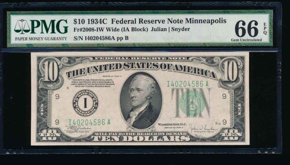One 1934C $10 Minneapolis Federal Reserve Note PMG 66EPQ.