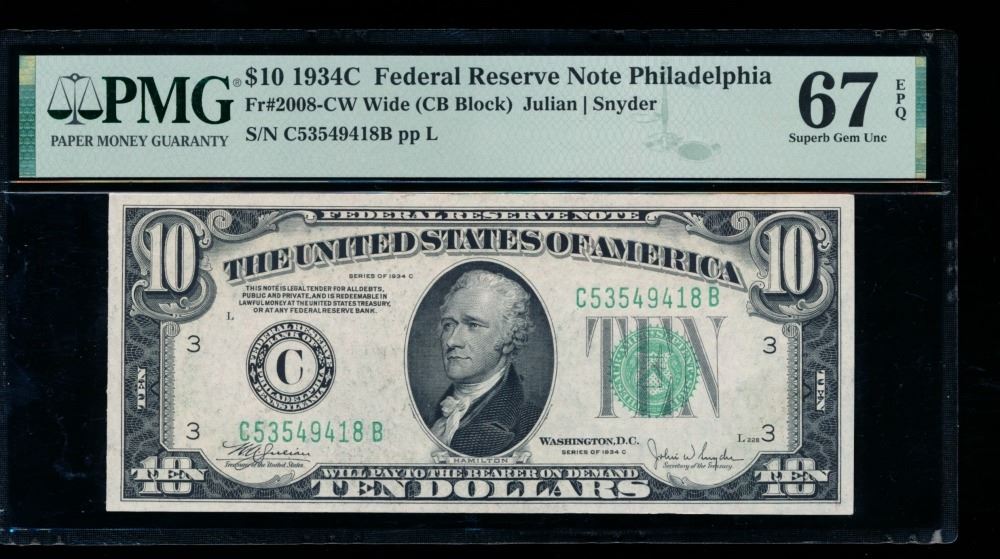 One 1934C $10 Philadelphia FRN PMG 67EPQ.
