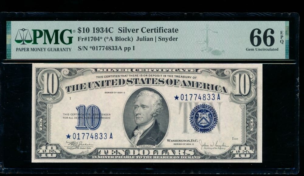 One 1934C $10 STAR Silver Certificate PMG 66EPQ.