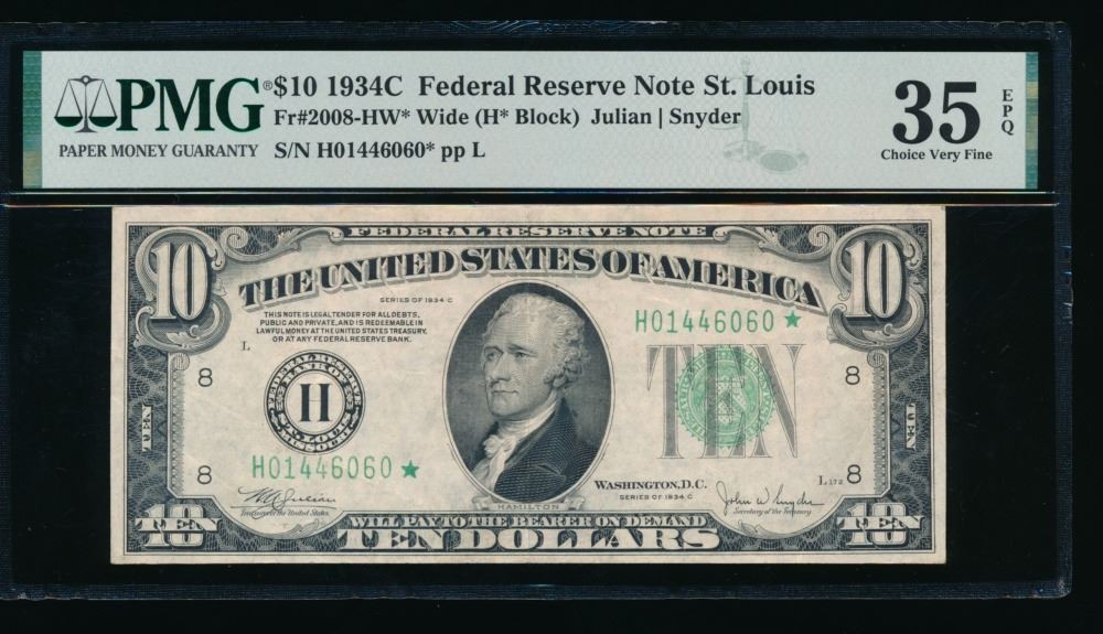 One 1934C $10 STAR St Louis FRN PMG 35EPQ.