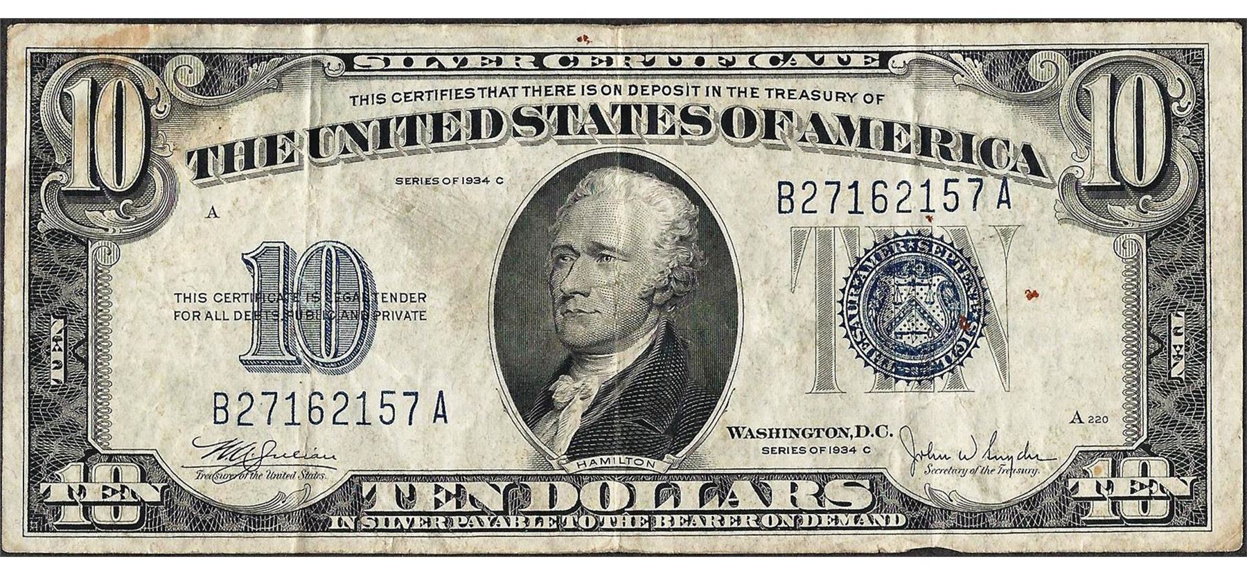 One 1934C $10 Silver Certificate Note.