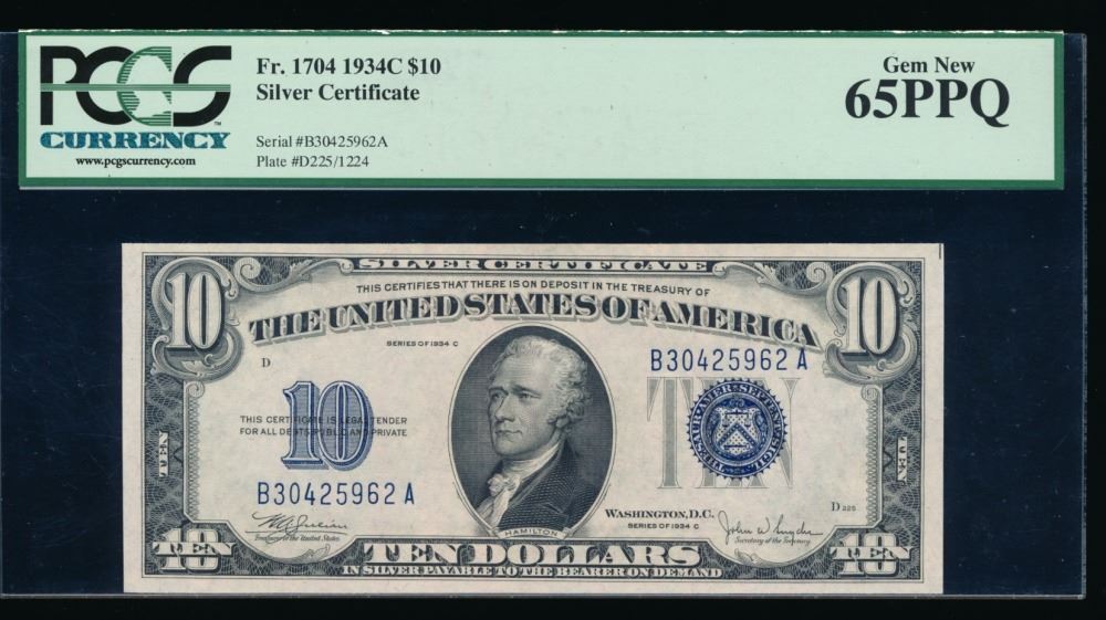 One 1934C $10 Silver Certificate PCGS 65PPQ.