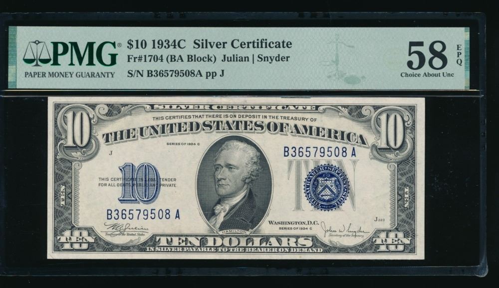 One 1934C $10 Silver Certificate PMG 58EPQ.