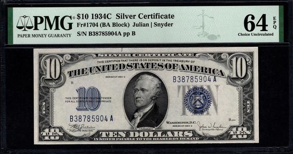 One 1934C $10 Silver Certificate PMG 64EPQ.