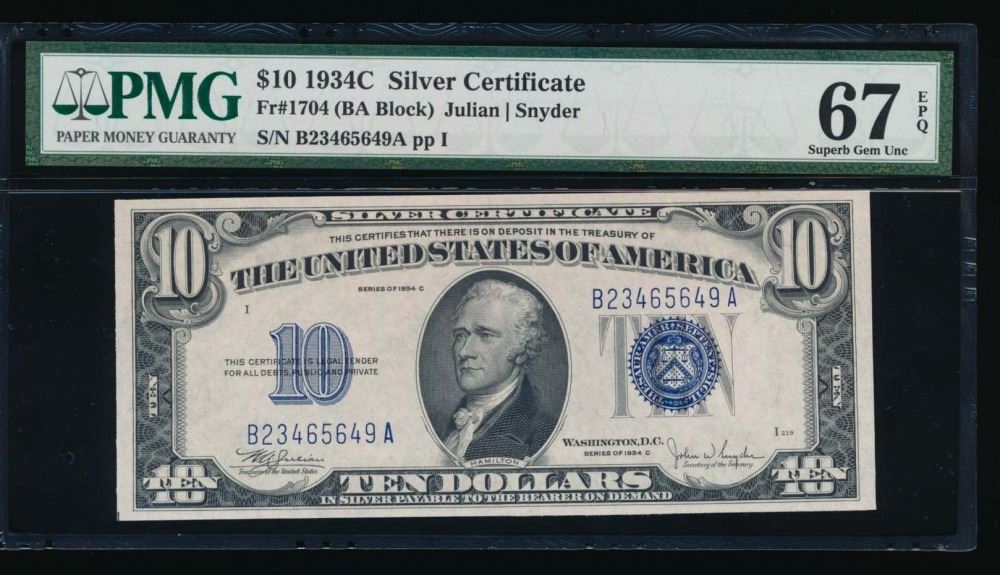 One 1934C $10 Silver Certificate PMG 67EPQ.