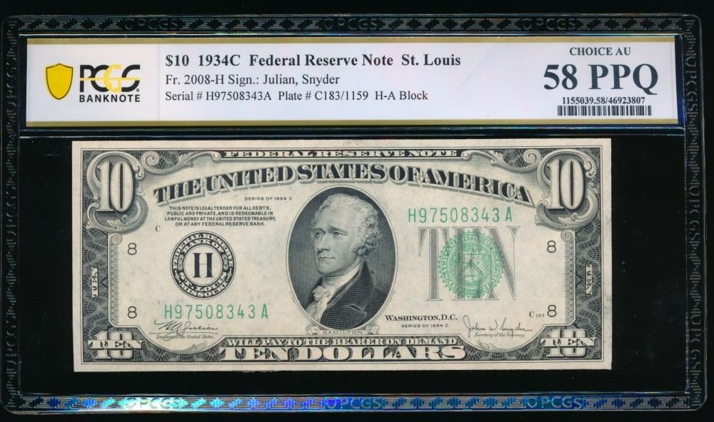 One 1934C $10 St Louis FRN PCGS 58PPQ.