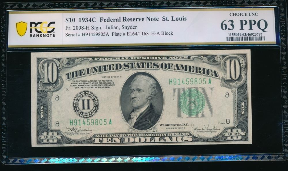 One 1934C $10 St Louis FRN PCGS 63PPQ.