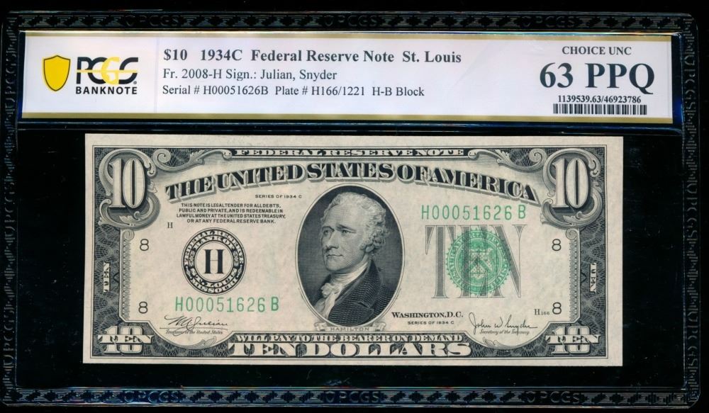One 1934C $10 St Louis FRN PCGS 63PPQ.