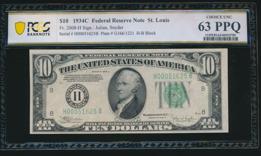One 1934C $10 St Louis FRN PCGS 63PPQ.