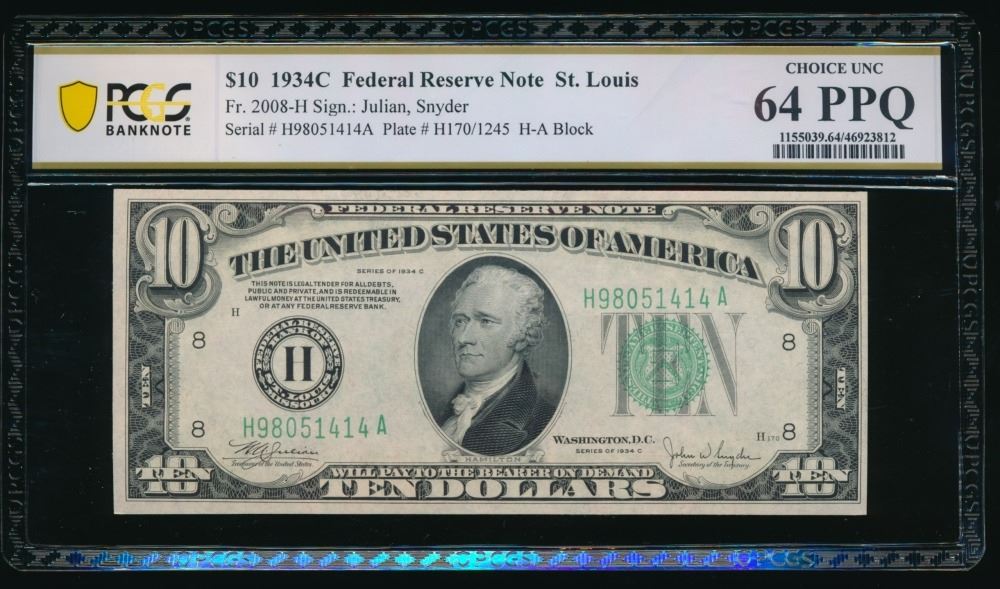 One 1934C $10 St Louis FRN PCGS 64PPQ.