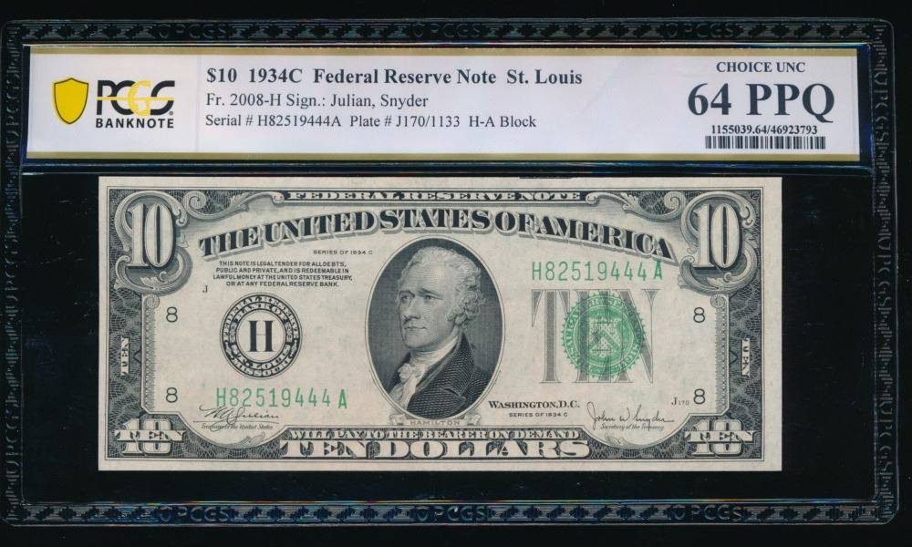 One 1934C $10 St Louis FRN PCGS 64PPQ.