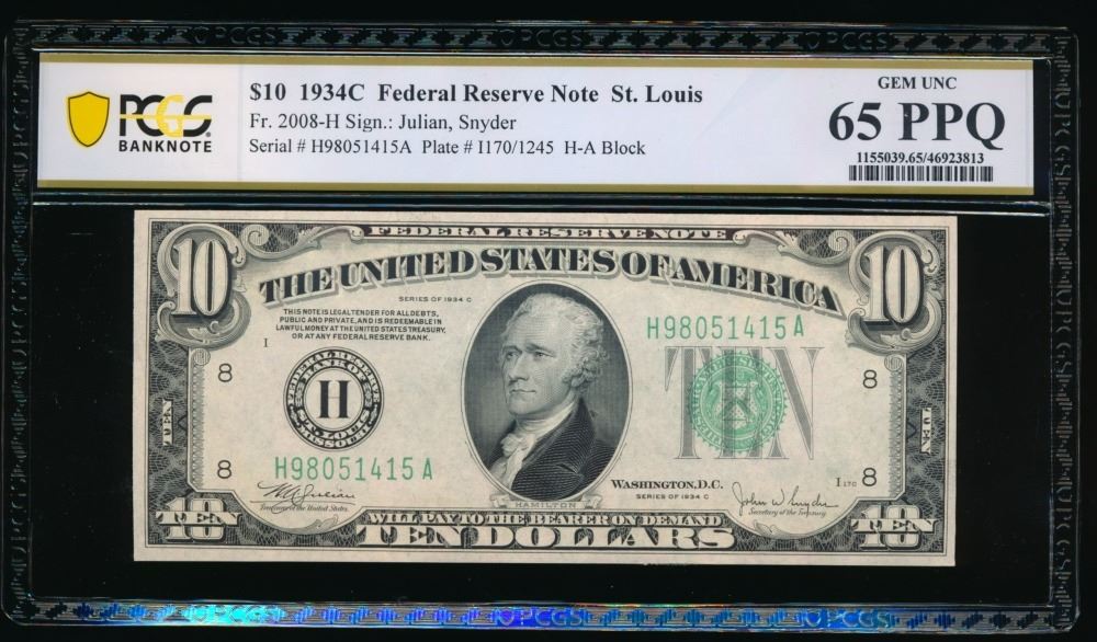 One 1934C $10 St Louis FRN PCGS 65PPQ.
