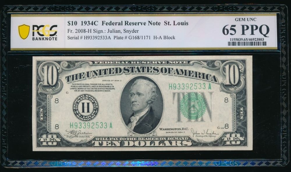 One 1934C $10 St Louis FRN PCGS 65PPQ.