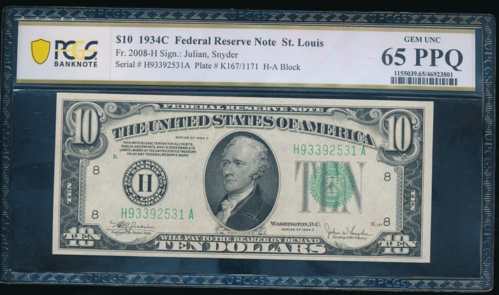 One 1934C $10 St Louis FRN PCGS 65PPQ.