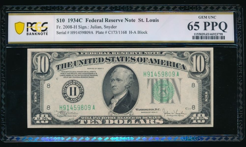 One 1934C $10 St Louis FRN PCGS 65PPQ.