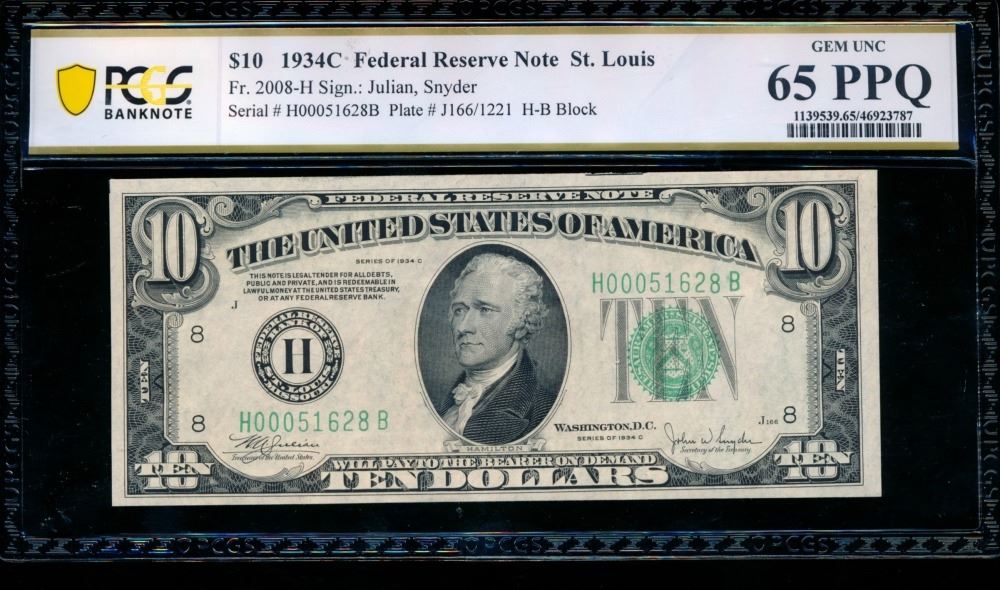 One 1934C $10 St Louis FRN PCGS 65PPQ.