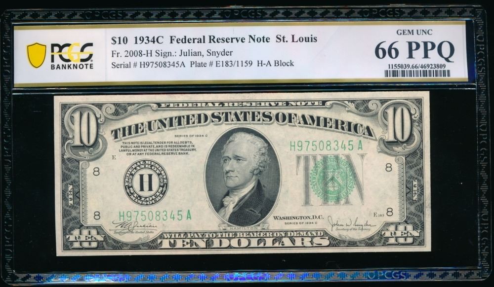 One 1934C $10 St Louis FRN PCGS 66PPQ.