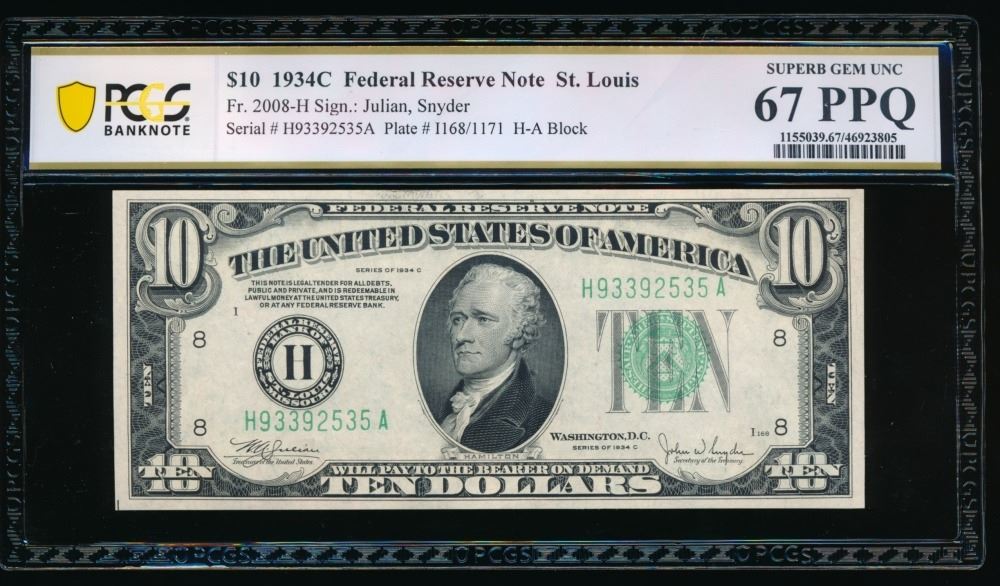 One 1934C $10 St Louis FRN PCGS 67PPQ.