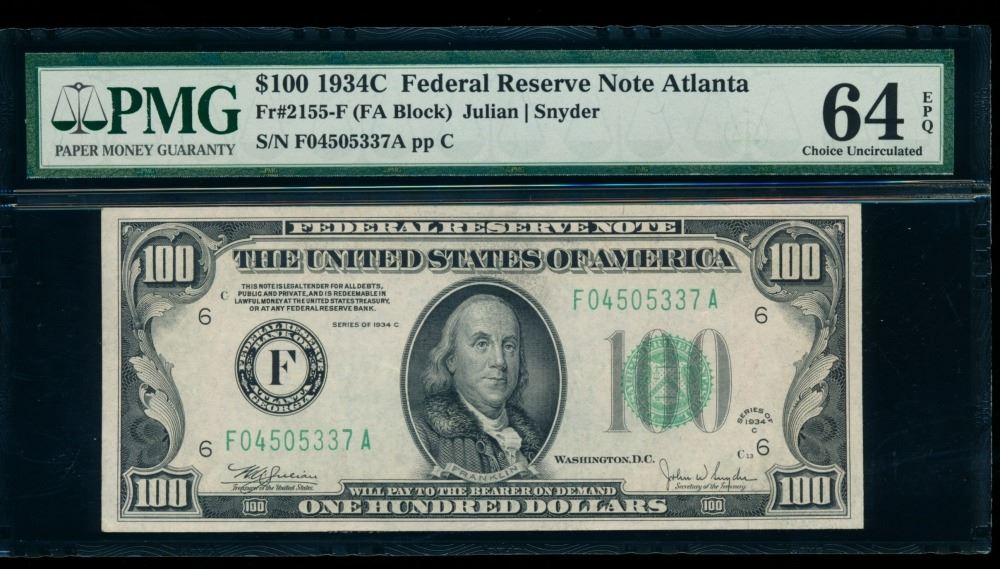 One 1934C $100 Atlanta FRN PMG 64EPQ.