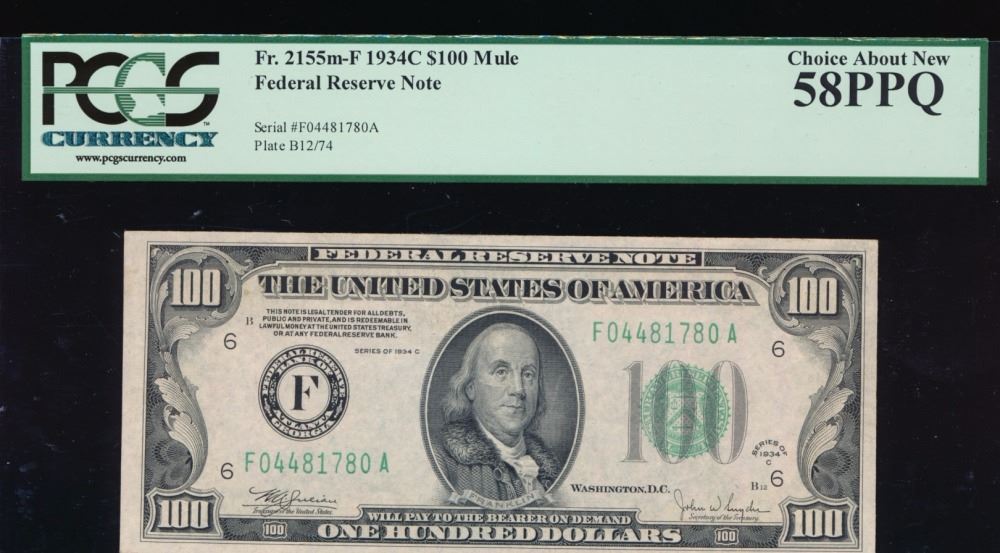 One 1934C $100 Atlanta Federal Reserve Note PCGS 58PPQ.