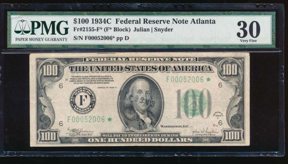 One 1934C $100 Atlanta Federal Reserve Star Note PMG 30.
