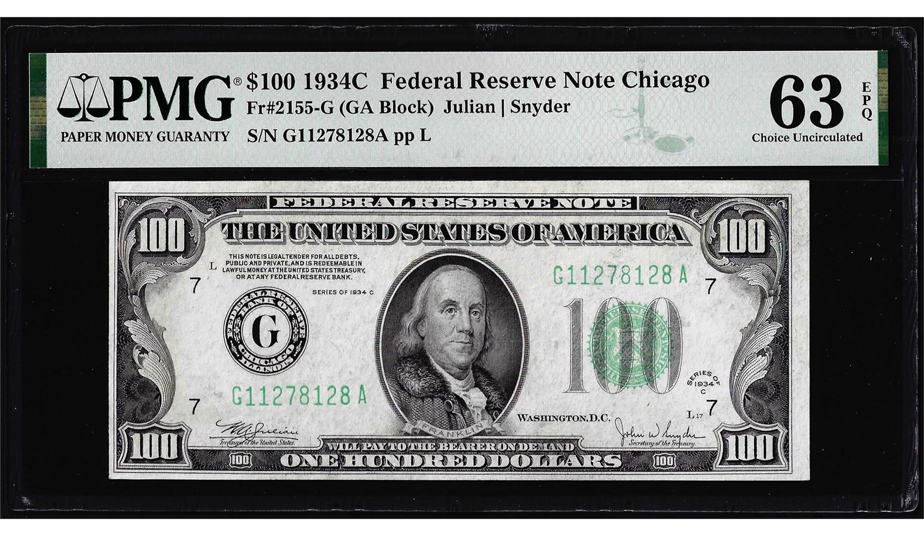 One 1934C $100 Federal Reserve Note Chicago Fr.2155-G PMG Choice Uncirculated 63EPQ. PMG Certified.
