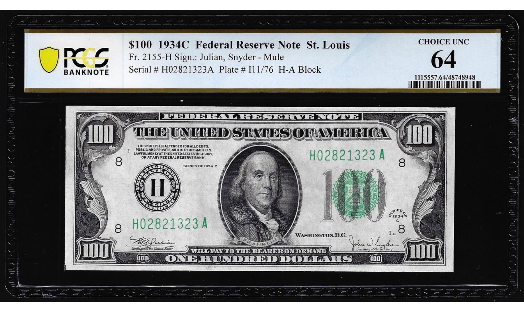 One 1934C $100 Federal Reserve Note St. Louis Fr.2155-H PCGS Choice Uncirculated 64. PCGS Graded.