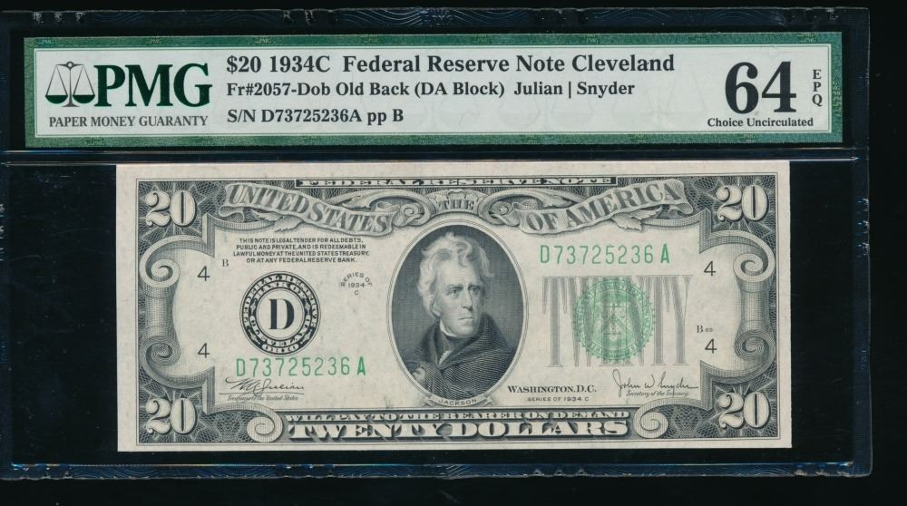 One 1934C $20 Cleveland FRN PMG 64EPQ.