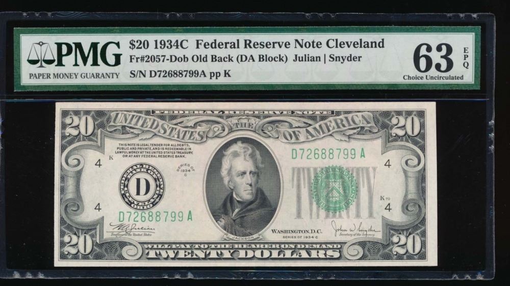 One 1934C $20 Cleveland Federal Reserve Note PMG 63EPQ.