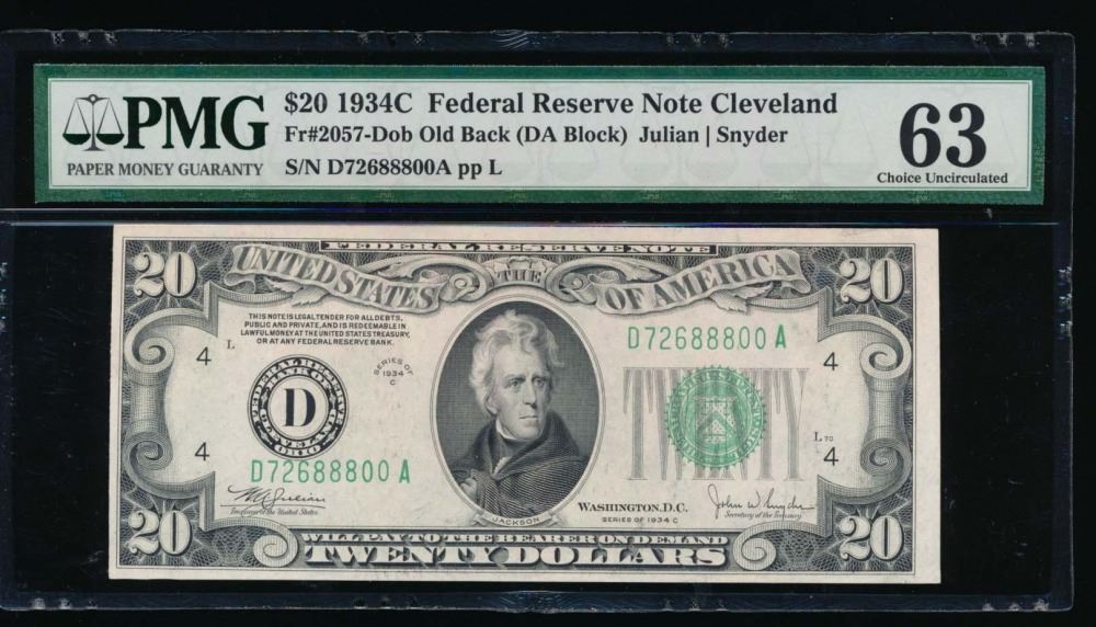 One 1934C $20 Cleveland Federal Reserve Note PMG 63.