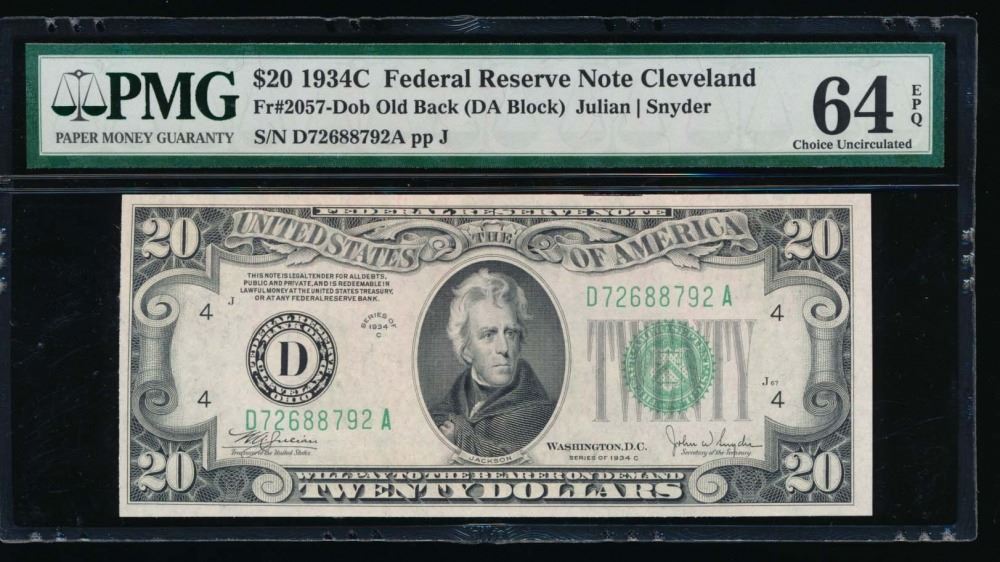 One 1934C $20 Cleveland Federal Reserve Note PMG 64EPQ.