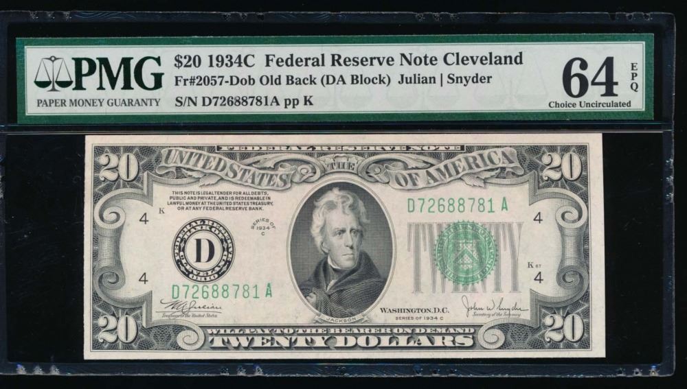 One 1934C $20 Cleveland Federal Reserve Note PMG 64EPQ.