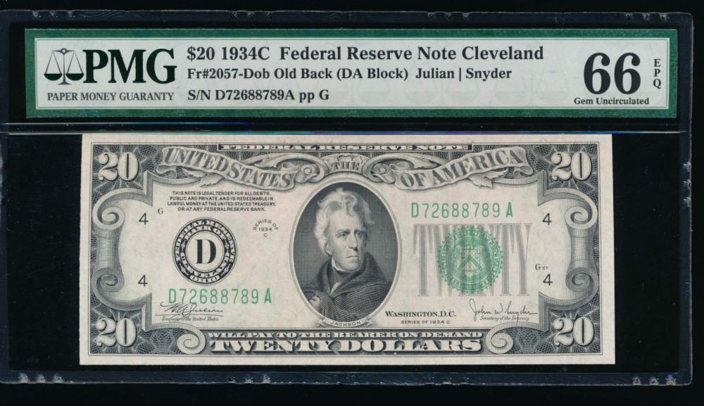 One 1934C $20 Cleveland Federal Reserve Note PMG 66EPQ.