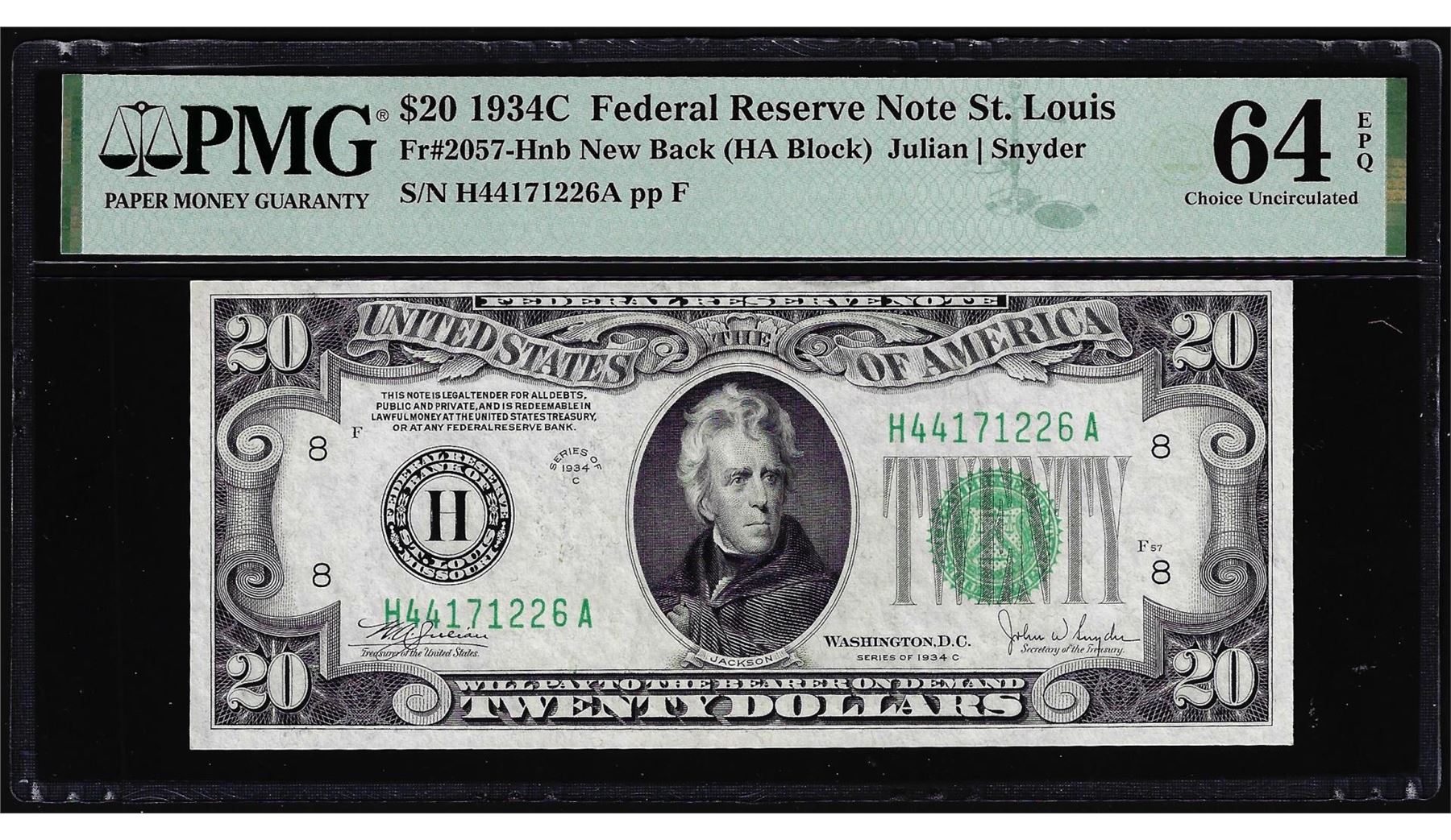 One 1934C $20 Federal Reserve Note St. Louis Fr.2057-Hnb PMG Choice Uncirculated 64EPQ. PMG Certified.