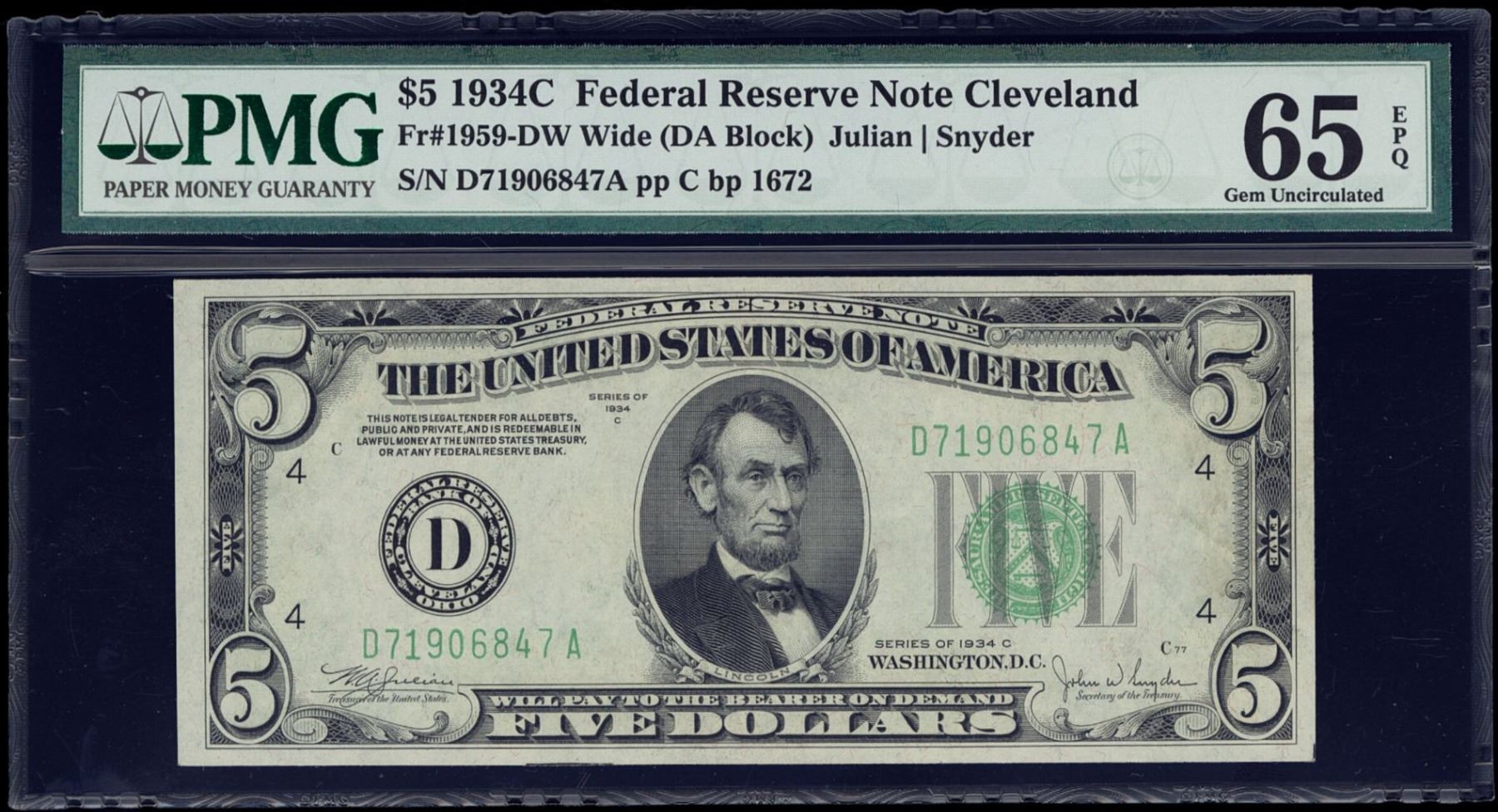 One 1934C $5 Cleveland FRN PMG 65EPQ.