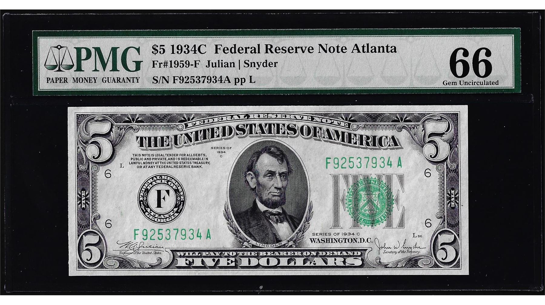 1934C $5 Federal Reserve Note Atlanta Fr.1959-F PMG Gem Uncirculated 66