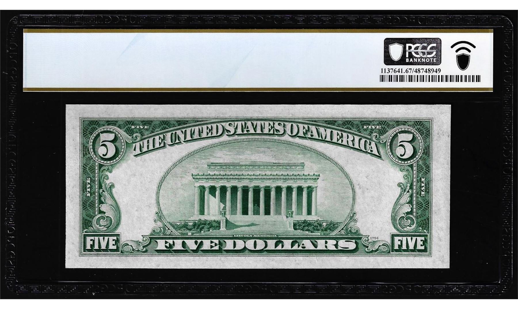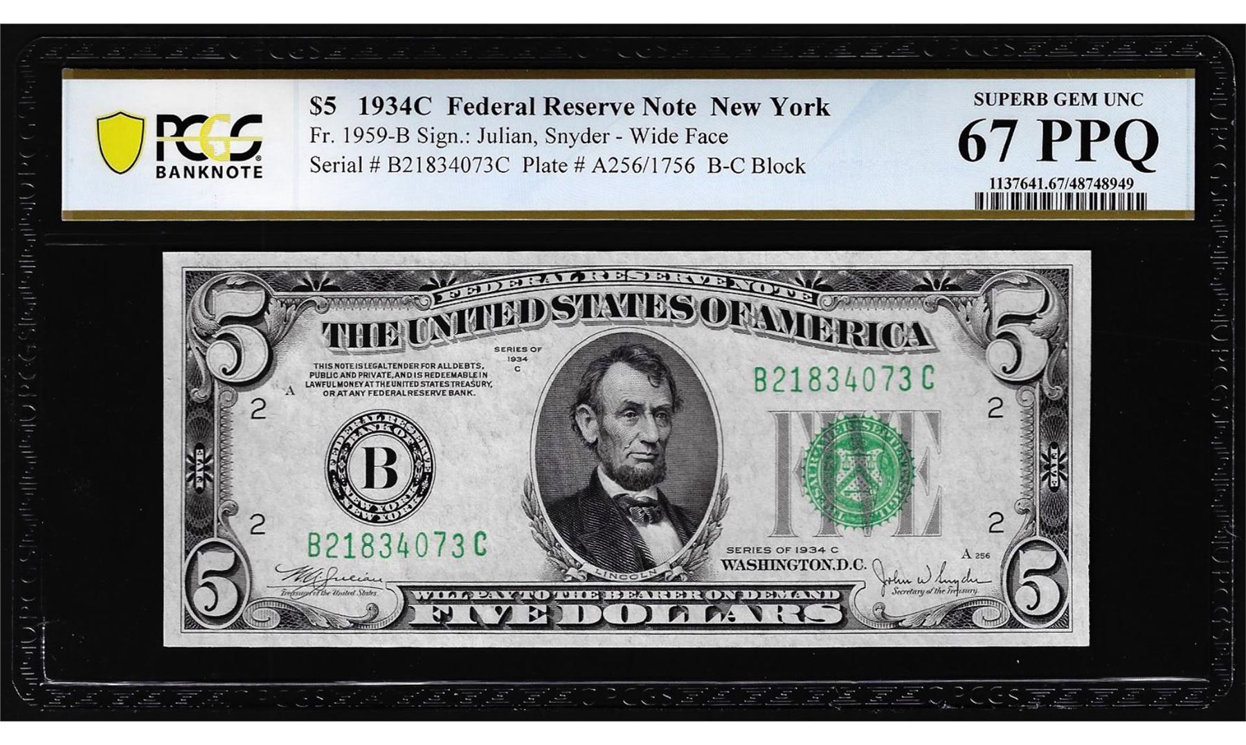 1934C $5 Federal Reserve Note New York Fr.1959-B PCGS Superb Gem Uncirculated 67PPQ